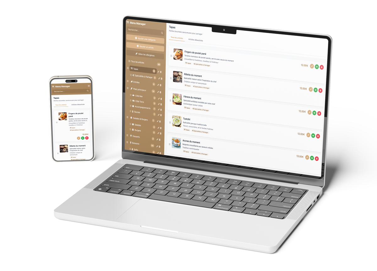 Un changement de prix ? Un nouveau plat du jour ? Votre plat phare est épuisé ce soir ? Mettez votre carte à jour en temps réel depuis un tableau de bord simple et accessible, sans aucune compétence technique. Votre menu en ligne est toujours le reflet exact de votre cuisine.