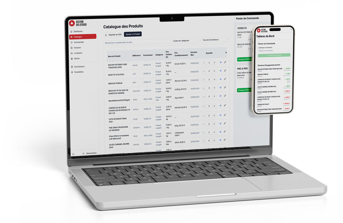 Construisez vos commandes depuis le catalogue, générez un PDF aux couleurs de votre restaurant et envoyez-le en un clic. Tous vos bons sont historisés et consultables sur le dashboard.